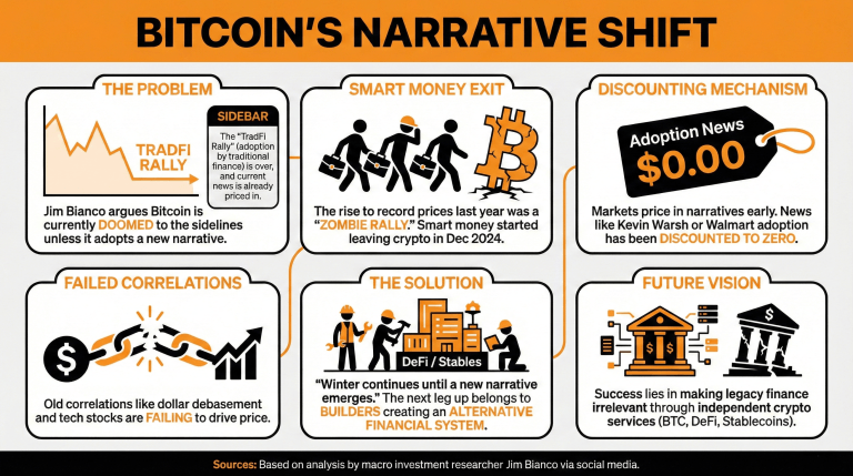 Jim Bianco, makrotalouden sijoitustutkija, uskoo, että ellei bitcoin omaksu erilaista narratiivia kuin viimeaikaiset omaksumisen saavutukset, se on tuomittu jäämään finanssimaailman sivulaitaan ilman katalysaattoreita tukemaan tulevaa hinnannousua.