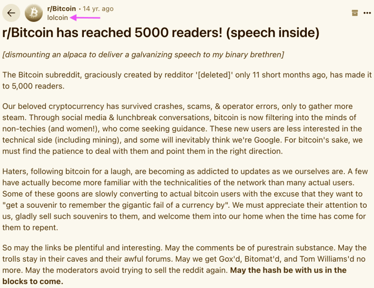 Tämä oli myös hetki, jolloin Bitcoin-yhteisö alkoi muodostua. Kun r/Bitcoin-subreddit saavutti 5 000 lukijaa alle vuodessa, käyttäjä nimeltään lolcoin—melko varmasti Goldstein—merkitsi tätä virstanpylvästä viestillä, jossa hän pohti Bitcoinin kestävyyttä. Hän huomautti, kuinka ei-tekniset käyttäjät, naiset ja jopa skeptikot, jotka seurasivat Bitcoinia “naurun vuoksi”, olivat muuttumassa todellisiksi osallistujiksi. Hänen havaintonsa oli selvä: Bitcoin ei ollut vain teknologiaa, siitä tuli kulttuuri.