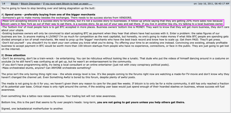 Goldstein ei tyytynyt pelkästään viihdyttämään; hän halusi toimintaa. 16. heinäkuuta 2011, kirjoittaessaan nimellä Laced With Kerosene BitcoinTalk.orgissa, hän teki vetoomuksen. Bitcoin tarvitsi menestystarinoita, ei pelkkiä spekulaatioita. Hän viittasi Meze Grilliin, ravintolaan, joka hyväksyi Bitcoinin, ja väitti, että todellinen voitto olisi Bitcoin-käyttäjien itsensä ajama myynnin kasvu.