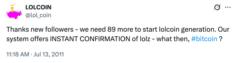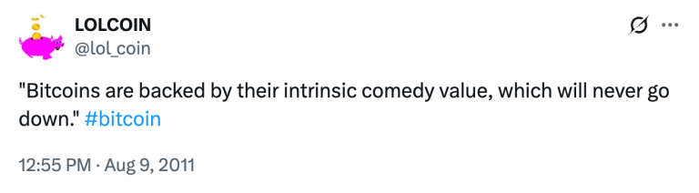 Goldsteinin piittaamattomuus levisi Twitteriin, jossa @lol_coin -tili julisti heinäkuussa 2011: “Bitcoinien arvo perustuu niiden olennaiseen huumoriarvoon, joka ei koskaan laske.” Vuonna 2011, kauan ennen meemikolikkojen nousua, hän kehysti Bitcoinin ei hauraana internet-rahana vaan kulttuurivoimana.