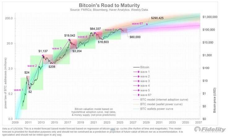 In the second chart labeled “ Bitcoin’s Road to Maturity,” Timmer mapped bitcoin’s historical waves from early price levels near $2 and $24 to later highs above $64,000 and a projected wave 6 zone pointing toward $290,425. The model incorporates adoption curves, wallet growth, and macro variables, presenting a long-term framework that extends toward the $1 million range over time. While the forecast is described as illustrative and not a price prediction, the visual analysis suggests that, if prior cyclical patterns and adoption trends persist, bitcoin could continue progressing along a structured maturation path following the current consolidation around $60,000.