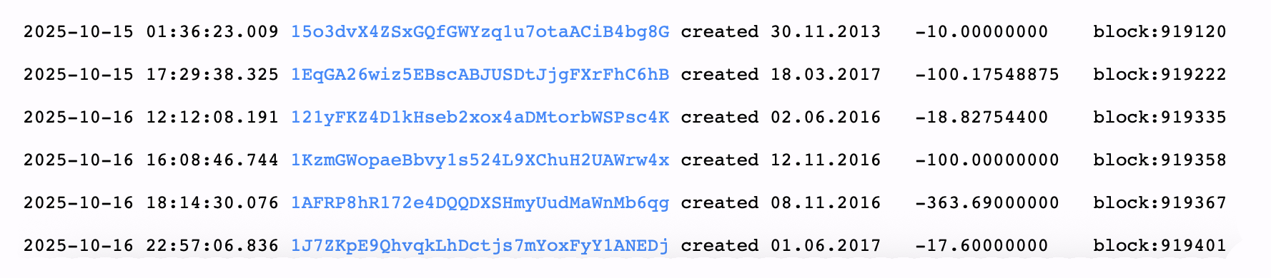 Jeudi, 18,82 BTC provenant d’un portefeuille né le 2 juin 2016 ont pris la route, atterrissant dans une nouvelle adresse inconnue détenant maintenant 19,0775103 BTC. Le transfert n’a pas été direct — les 18,82 BTC ont été divisés en deux étapes avant d’atteindre leur nouvelle maison. Pendant ce temps, au bloc 919358, un autre portefeuille de poids de novembre 2016 s’est réveillé, déplaçant 100 BTC.