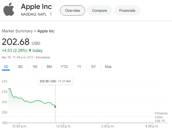 L’action Apple a augmenté de 2,37 % au moment de la rédaction, s’échangeant à 202,64 $. Le S&P 500 a grimpé de 0,88 %, le Dow a augmenté de 0,74 % et le Nasdaq a vu une hausse de 0,40 %. Pas de grands mouvements, mais une tendance à la hausse néanmoins.