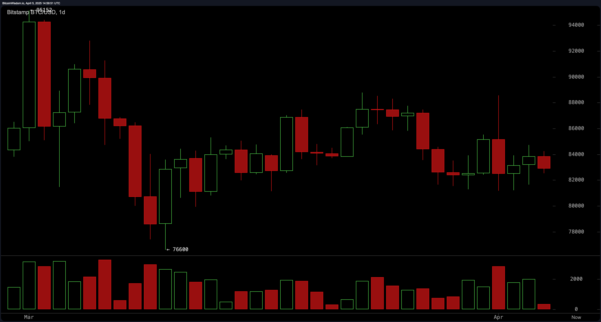 D’un point de vue quotidien, le bitcoin est entré dans une phase de consolidation après s’être retiré d’un sommet récent d’environ 94 000 $ à un creux près de 76 600 $. L’activité des prix actuelle est confinée à une fourchette entre 82 000 $ et 84 500 $, le marché démontrant une indécision à travers des motifs doji et des mèches étendues. Le retracement de Fibonacci de 38,2% sur le graphique quotidien est autour de 84 265 $, s’alignant avec l’action de prix actuelle, tandis que les niveaux de 50% et de 61,8% à 85 300 $ et 86 335 $ respectivement présentent une résistance critique. Une cassure et une clôture au-dessus de 85 500 $ avec un volume fort confirmeraient une inversion haussière, tandis qu’une chute sous 81 500 $ pourrait déclencher de nouvelles baisses vers 78 000 $.