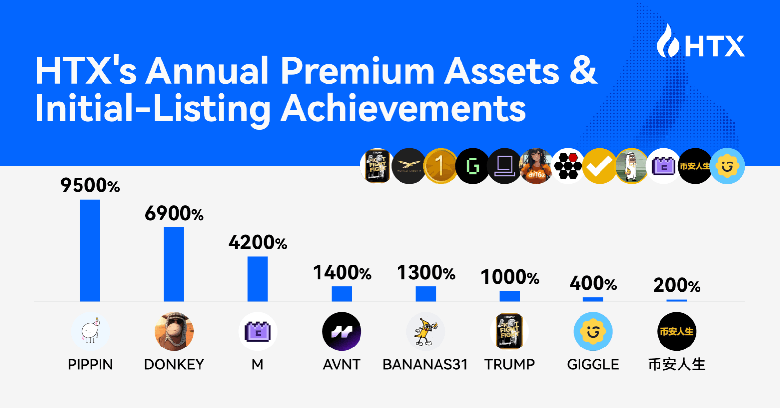 Selon le rapport annuel de HTX, la bourse a ajouté 166 cryptomonnaies tout au long de l’année 2025. La stratégie d’actifs de HTX s’est constamment concentrée sur des projets ayant un fort élan narratif, une résonance communautaire et un potentiel de valeur à long terme. En 2025, cela s’est traduit par plusieurs cotations initiales à fort impact, notamment PIPPIN (95x), DONKEY (69x), M (42x), et TRUMP (10x).