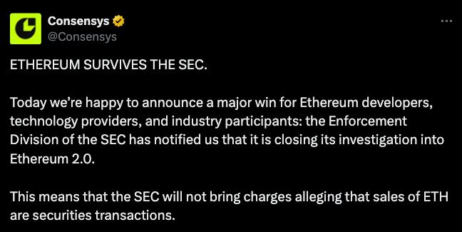 Pendant ce temps, la SEC a abandonné son enquête sur Ethereum cette semaine, admettant essentiellement que ETH n’est pas un titre financier.