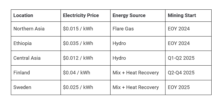 Avec le prix actuel de l’électricité de 0,045 $ / kWh, les mineurs d’Infinity Hash sont déjà très compétitifs. Cependant, atteindre un prix de l’électricité encore plus bas améliorerait les marges de profit pour les actionnaires. Dans cet objectif, Infinity Hash étend son opération à quelques nouveaux emplacements géographiques avec des prix très bas de l’électricité :