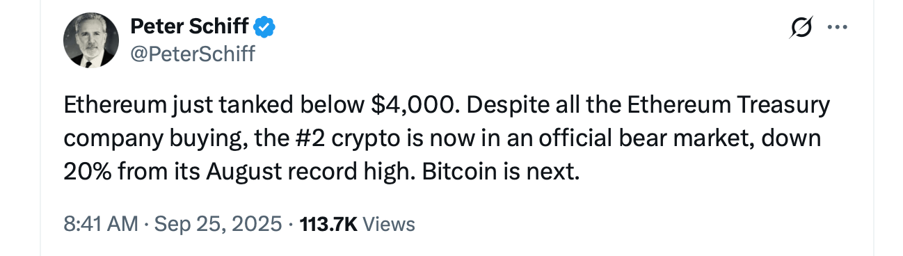 Ethereum (ETH) a glissé vers le chiffre rond après une dépression en milieu de semaine qui a expulsé l’effet de levier du marché. La performance sur sept jours reste dans la fourchette de −4% à −5%, avec des cotations intrajournalières oscillant entre 3 950 $ et 4 050 $, avec de brèves incursions sous cette ligne alors que les acheteurs à la baisse testaient leur courage.