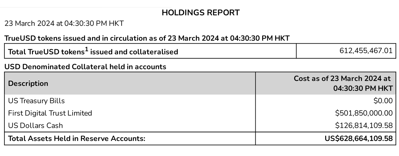 Depuis la récupération de son ancrage, la monnaie a continué à voir une réduction graduelle de son offre. Les efforts de transparence du TUSD sont soulignés par son tableau de bord d’équilibre en temps réel Verinumus, qui détaille les actifs soutenant les jetons. Actuellement, l’audit du tableau de bord montre 501 millions de dollars en actifs collatéraux détenus par First Digital Trust Limited, plus de 126 millions de dollars en espèces USD, et zéro note du Trésor américain. L’audit révèle que le collatéral est surveillé et géré par Techteryx dans des dépôts à Hong Kong, en Suisse, et aux Bahamas.