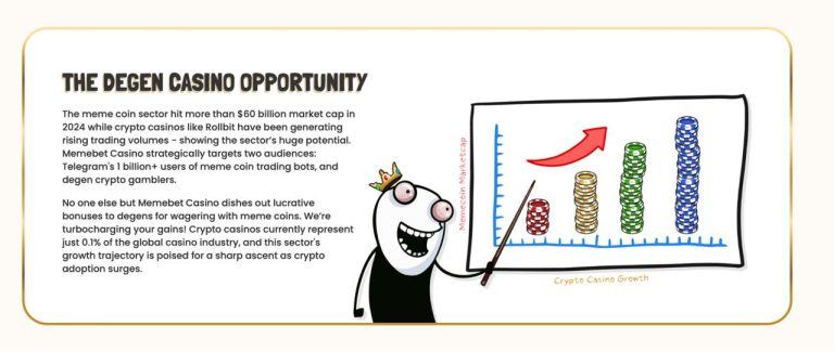 En ce qui concerne la croissance potentielle de Memebet, le projet se positionne à l’intersection de deux secteurs en pleine expansion. Actuellement, le marché des pièces de mèmes vaut plus de 40 milliards de dollars, tandis que les jeux d’argent en ligne génèrent 100 milliards de dollars de revenus annuels – et cela devrait atteindre 130 milliards de dollars en cinq ans.
