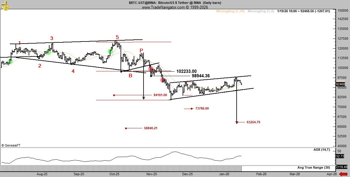 L’attention du marché s’est intensifiée après une projection audacieuse à la baisse pour le bitcoin qui a circulé parmi les traders. Le trader vétéran de matières premières et de change Peter Brandt, qui négocie depuis 1975, a partagé sur la plateforme sociale X le 19 janvier 2026, que le bitcoin pourrait se diriger vers une plage de 58 000 $–62 000 $ en raison d’une faiblesse technique continue.