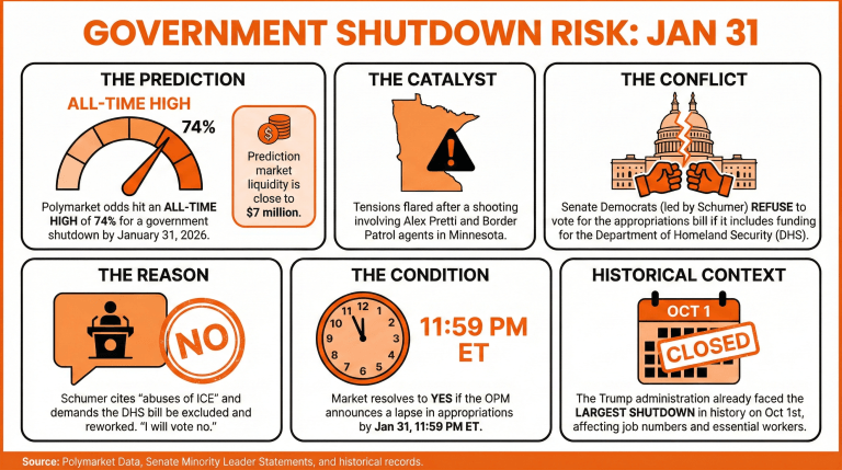 Quelles sont les chances actuelles d’une fermeture du gouvernement aux États-Unis ? Les chances de Polymarket indiquent une probabilité de 74% d’une fermeture du gouvernement se produisant d’ici le 31 janvier 2026, suite aux récents incidents impliquant des agents de la patrouille des frontières.