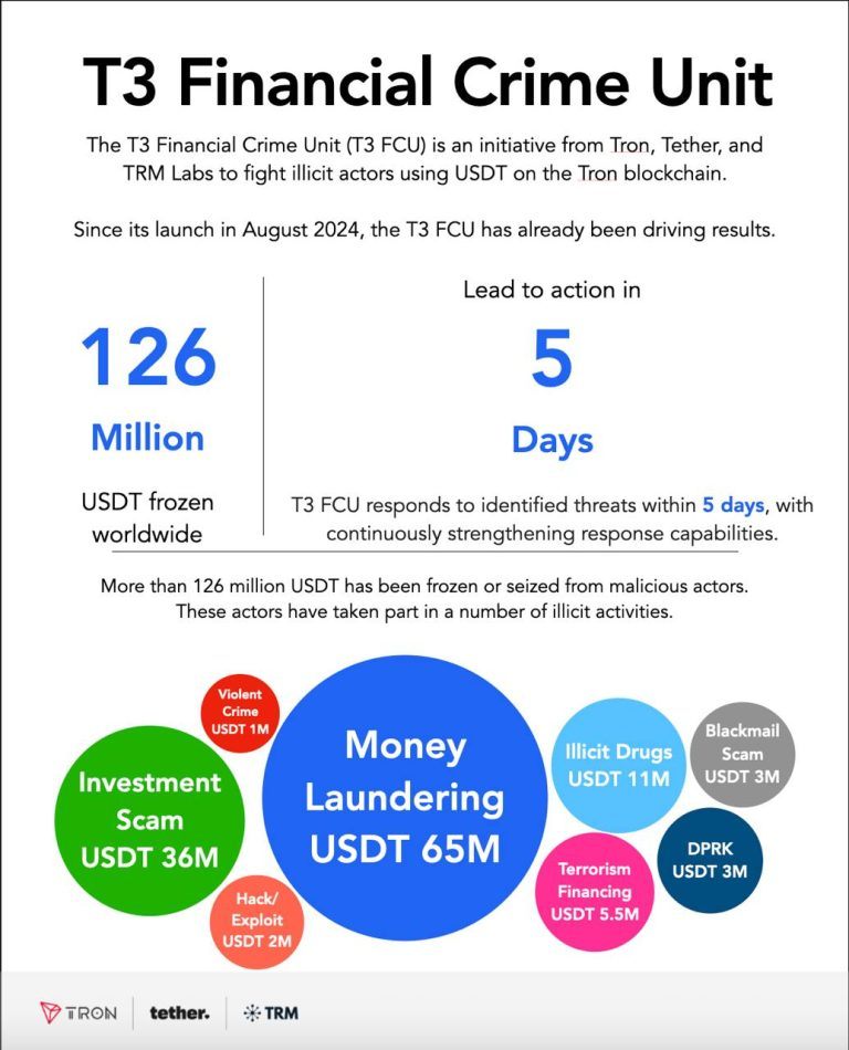“La capacité de T3 FCU à travailler en étroite collaboration avec les forces de l’ordre dans le monde entier pour perturber efficacement les cybercriminels utilisant l’USDT sur TRON est une preuve de concept des partenariats public-privé,” a déclaré Chris Janczewski, responsable des enquêtes mondiales chez TRM Labs. “Dépasser les 100 millions de dollars USDT d’actifs gelés n’est que le début. En 2025 et au-delà, alors que de plus en plus d’utilisateurs légaux entrent dans l’écosystème croissant des cryptomonnaies, il est plus important que jamais de le garder en sécurité. T3 est dédiée à cette mission.”