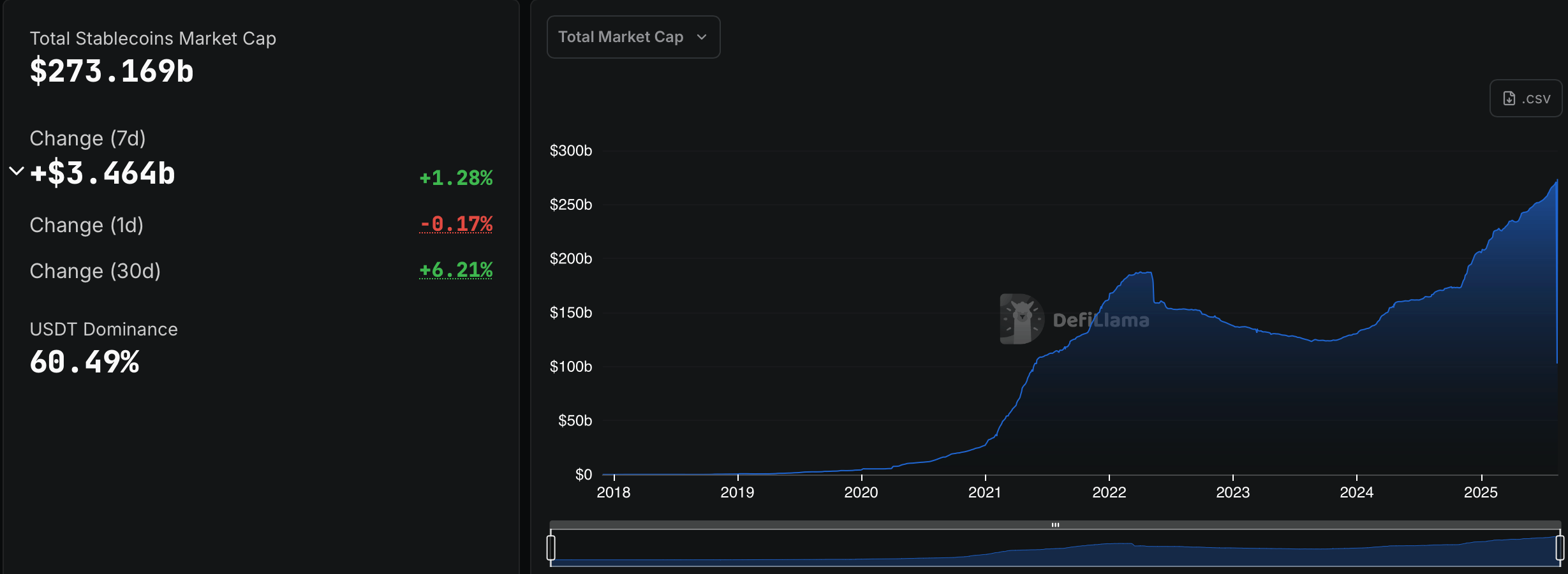 Au cours de la semaine dernière, le marché des stablecoins s’est étendu de 1,28 %, ajoutant 3,464 milliards de dollars pour atteindre un total de 273,169 milliards de dollars. Tether (USDT) reste le poids lourd, avec une domination de 60,49 % de l’ensemble du marché, avec son approvisionnement grimpant d’environ 730 millions de pièces au cours de la période de sept jours.