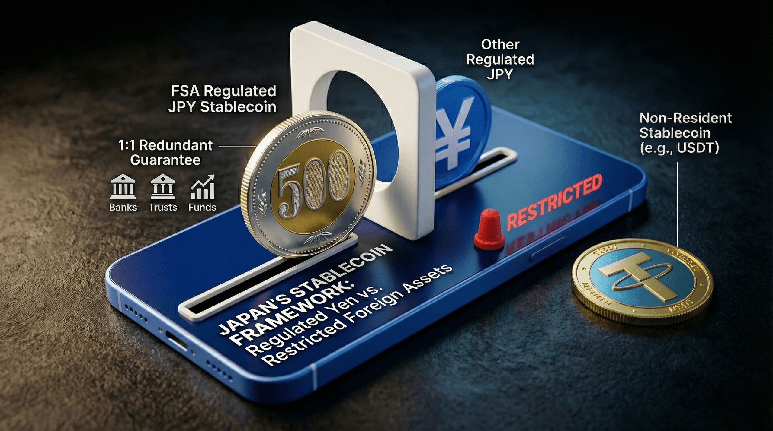 Tá iarmhairt dhíreach ag an ailtireacht sin do USDT agus USDC. Rialaíonn stábla-chriptea-airgeadraí ainmnithe i ndollair thart ar 97 go 99% de mhargadh domhanda na stábla-chriptea-airgeadraí, ach níl iontu ach codán den sciar sin sa tSeapáin. Ní féidir le heisitheoirí eachtracha cosúil le Tether agus Circle dáileadh ar chónaitheoirí Seapánacha gan na caighdeáin chéanna cosanta úsáideoirí agus AML a chomhlíonadh agus a cheanglaítear ar eintitis intíre, tairseach nach mbaintear amach ach go hannamh.
