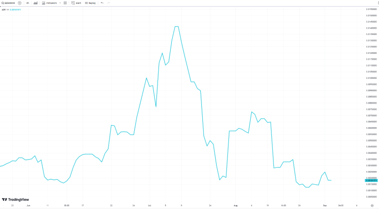 The Average Day Range (ADR) technical indicator measures the average volatility of an asset over a specified period, helping to assess potential price fluctuations and the associated risk level of an investment. For GOMINING, the ADR (14), which reflects a 14-day period, indicates a decrease in volatility over recent weeks. The chart shows peaks in volatility during early to mid-July, most likely driven by overall market volatility at the time rather than any issues specific to the GOMINING token. Following these peaks, there has been a noticeable decline in the ADR value. The current value comes in at 0.0018, suggesting a period of low volatility. This reduced volatility benefits traders and investors who prefer a balanced risk-reward profile. This stability makes the token particularly appealing to those seeking to minimize risk while maintaining exposure to potential gains.