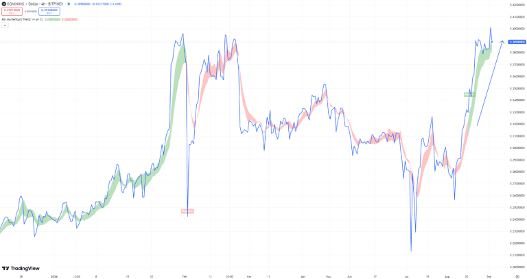 Meanwhile, the Relative Strength ( RSI) Momentum Trend Index, which considers the previous RSI value, current RSI value, and positive change in the 5-period exponential moving average (EMA) of the closing price, also shows a strong upward trend for the GOMINING token, gaining strength and entering a phase of confident growth.