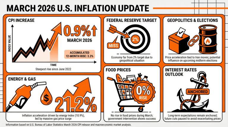 הלשכה לסטטיסטיקה של העבודה בארה״ב פרסמה את נתוני מדד המחירים לצרכן (CPI) למרץ, כאשר המדד הייחוס עלה ב-0.9% לאחר עלייה של 0.3% בפברואר, ובמצטבר עלה בסך הכול ב-3.3% במהלך 12 החודשים האחרונים. ההאצה נובעת ממדד האנרגיה, שעלה ב-10.9% במרץ, בהובלת עלייה של 21.2% במחירי הדלק; מנגד, המזון לא רשם עלייה במהלך מרץ, סימן לכך שהממשלה זכתה להצלחה מסוימת בניסיונה לשלוט במחירי המצרכים.