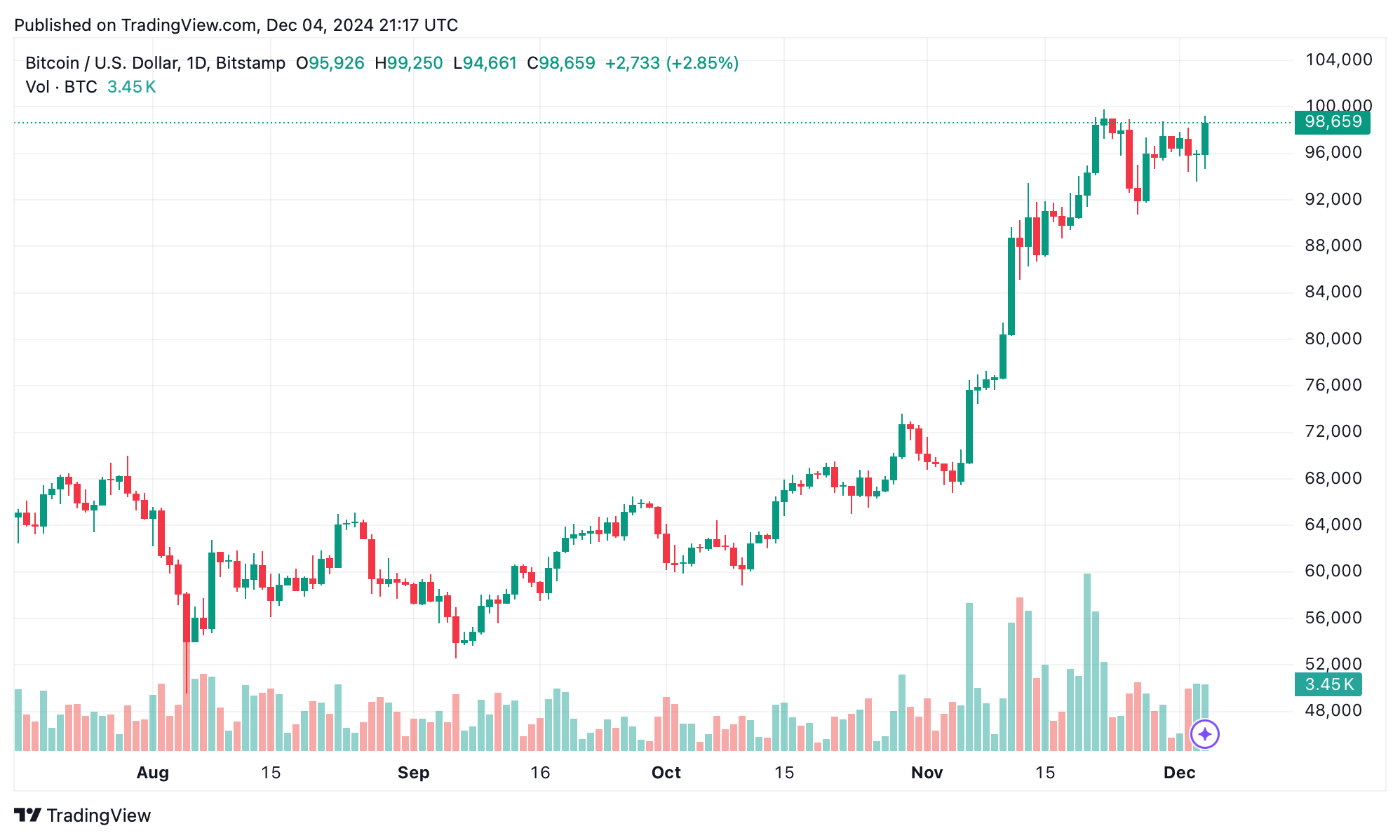 आज बिटकॉइन (BTC) ने प्रति सिक्का $99,240 का नया इंट्राडे हाई हासिल किया, जो क्रिप्टोक्यूरेंसी बाजार में एक महत्वपूर्ण उपलब्धि है।