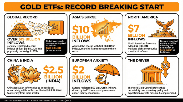 A Világ Arany Tanácsa (WGC) jelentette, hogy a fizikailag fedezett arany ETF-ek rekord beáramlást regisztráltak januárban, több mint 19 milliárd dollár áramlott ezekbe az alapokba a befektetők részéről. Az észak-amerikai és ázsiai piacok vezették a keresletet az árak közelmúltbeli csökkenése ellenére.