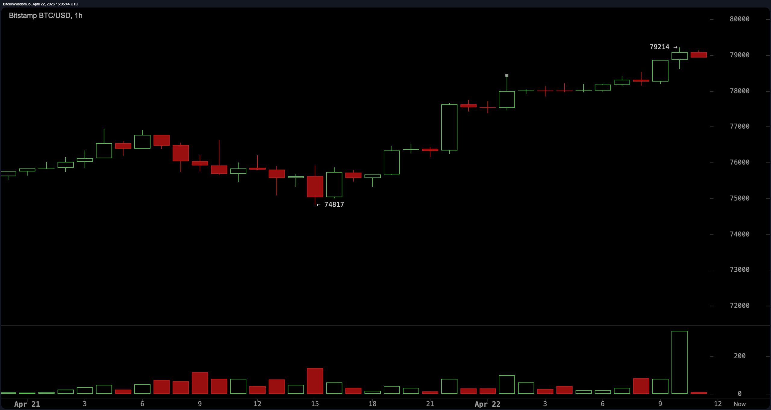Bitcoin dibuka pada 22 April di sekitar $76.342 dan mencapai level tertinggi intraday di $79.214 sebelum menetap di kisaran $78.800 hingga $78.900, naik sekitar 4,1% pada hari itu. Volume perdagangan 24 jam melampaui $47 miliar. Pergerakan ini menandai kenaikan harian terkuat dalam beberapa pekan terakhir dan memperpanjang pemulihan dari level terendah tahun ini di sekitar $60.057 yang dicatat pada 6 Februari.