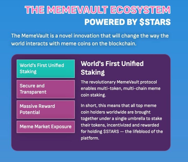 Daya tarik utama dari proyek ini adalah MemeVault – sebuah platform yang memungkinkan investor untuk melakukan staking pada koin meme favorit mereka untuk mendapatkan hadiah besar.