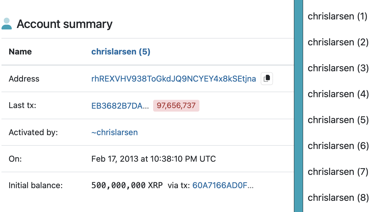 Delapan dompet XRP yang diduga terkait dengan salah satu pendiri Ripple, Chris Larsen, ditandai 1 hingga 8 di xrpscan.com. Dompet 1 hingga 4 masing-masing menyimpan sedikit lebih dari 500 juta XRP, sementara dompet 5 berisi 282,49 juta, dan dompet 6 menyimpan 300,18 juta.