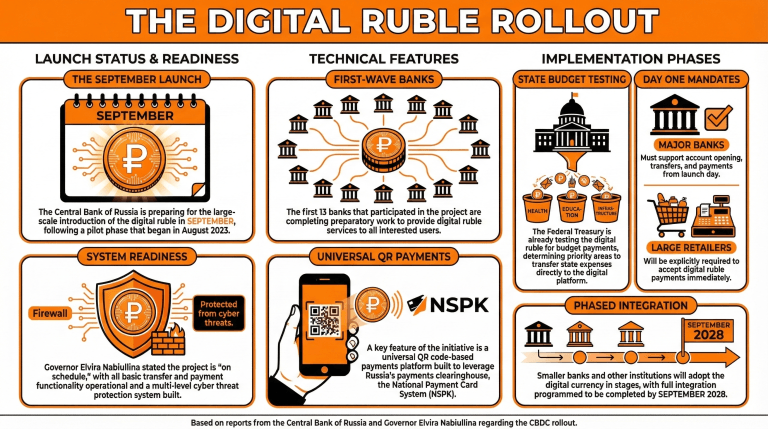 Bank-bank kecil dan lembaga lain akan mulai mengadopsi rubel digital secara bertahap, dengan integrasi penuh direncanakan pada September 2028.