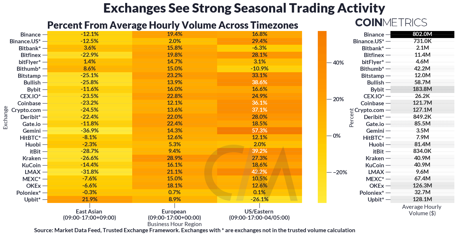 Penemuan Coin Metrics mengungkapkan bahwa aktivitas perdagangan sejalan dengan pola musiman dan regional. Pertukaran seperti Bithumb dan Upbit menunjukkan aktivitas puncak selama jam Asia Timur, sementara platform Amerika seperti Coinbase dan Gemini lebih menyukai zona waktu AS. Binance menunjukkan jangkauan yang lebih luas, dengan peningkatan aktivitas selama jam Eropa.