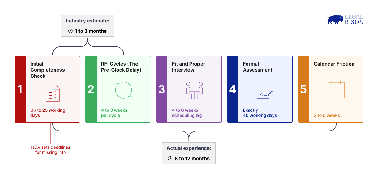 Fase 3 – Colloqui di idoneità: tempi di programmazione da 4 a 6 settimane nelle giurisdizioni che richiedono colloqui dal vivo. Anche questo viene tipicamente finalizzato prima che l’NCA timbri ufficialmente la domanda come completa. Fase 4 – Valutazione formale: esattamente 40 giorni lavorativi. Questo rigoroso conto alla rovescia previsto dalla legge inizia solo una volta che le Fasi da 1 a 3 sono state completamente risolte. Questo conto alla rovescia non si interrompe. Eventuali domande chiarificatrici finali devono essere presentate entro il 20° giorno lavorativo e non interrompono il conto alla rovescia. Fase 5 – Attriti di calendario: da 3 a 6 settimane in totale. Ciò dipende dai tempi di presentazione, dai giorni festivi, dalle ferie del personale e dagli arretrati giurisdizionali che si accumulano durante l'intero processo. Totale realistico: da 8 a 12 mesi dalla presentazione alla concessione dell'autorizzazione.