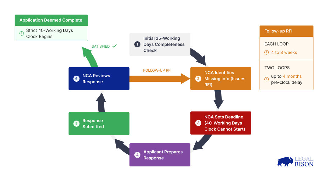 2. La presentazione non è il punto di partenza. Il periodo di valutazione di 40 giorni lavorativi inizia solo dopo che l'NCA ha formalmente dichiarato completa una domanda. La verifica di completezza è una fase separata in cui l'NCA ha fino a 25 giorni lavorativi solo per esaminare la presentazione iniziale. Se mancano informazioni, l'NCA fissa una scadenza rigorosa entro la quale il richiedente deve fornire i dettagli mancanti e può rifiutarsi di esaminare la domanda nel suo complesso se tale scadenza non viene rispettata.