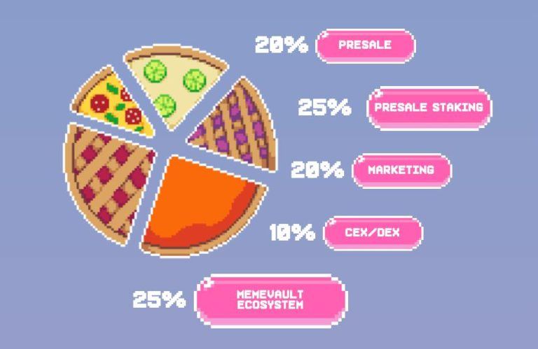 La distribuzione è semplice: 20% per la prevendita, 25% ciascuno per le ricompense di staking e l’ecosistema MemeVault, 20% per il marketing e 10% per le quotazioni in borsa.