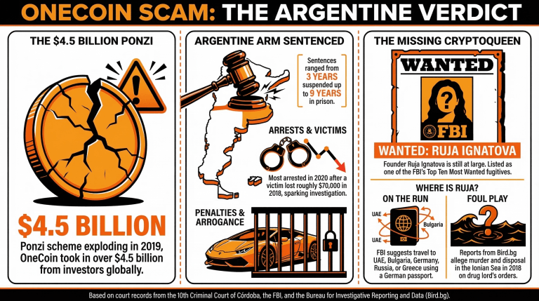 Cosa è successo agli operatori di Onecoin in Argentina? Un tribunale di Córdoba ha condannato 12 persone della filiale locale a pene detentive fino a nove anni per il loro ruolo nello schema Ponzi.
