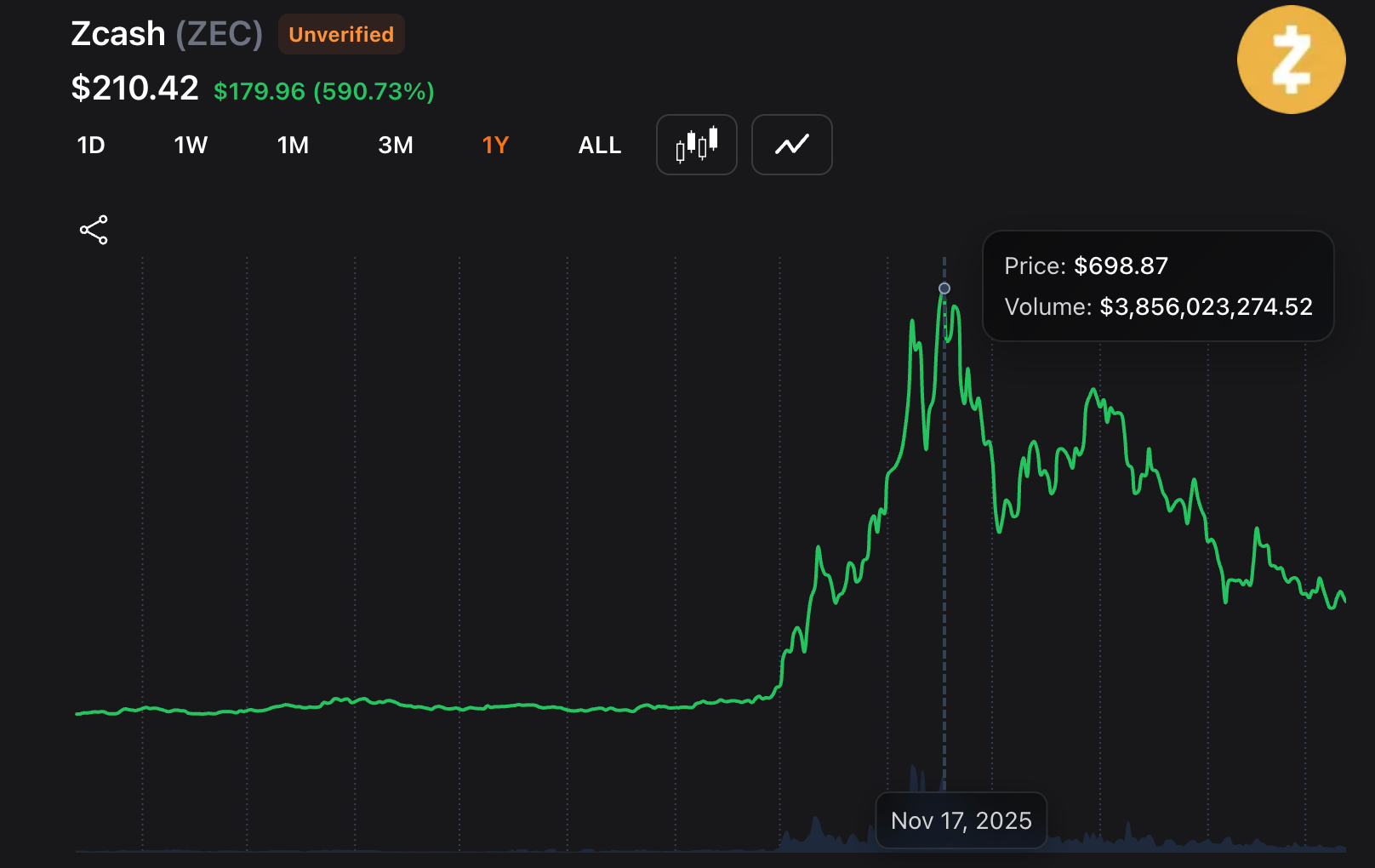 L'interesse per ZEC è aumentato nel corso del 2025, alimentato dalle approvazioni e dai commenti di figure di spicco nel mondo delle criptovalute. La rinnovata attenzione ha contribuito a far salire il prezzo del token di quasi il 600% nell'ultimo anno, anche se da allora l'asset ha registrato un calo significativo rispetto ai massimi raggiunti alla fine del 2025.