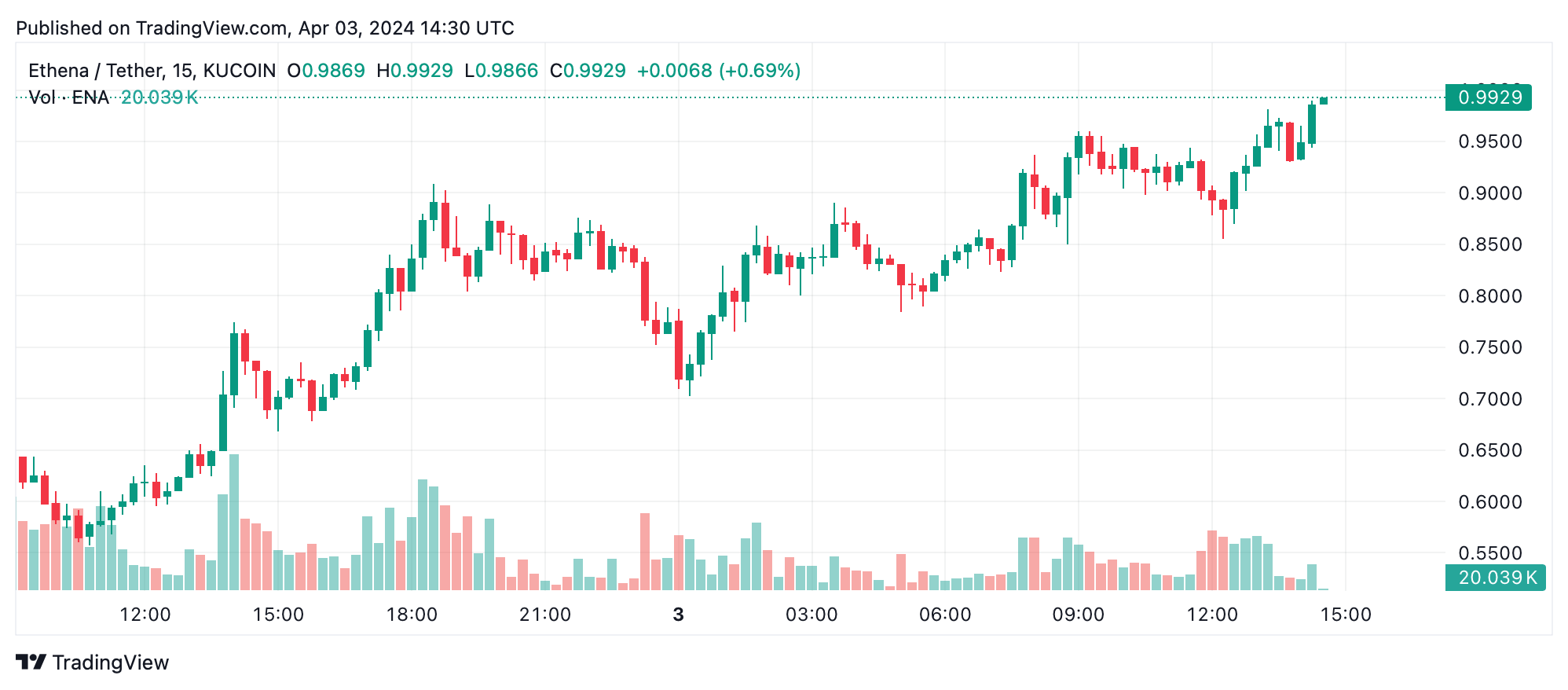 Dal suo lancio il 2 aprile, il token di governance di Ethena ENA ha registrato un aumento dell’80% del suo valore rispetto al dollaro statunitense, salendo da un minimo storico di $0,532 per token. Attualmente, si classifica tra le prime 100 monete per capitalizzazione di mercato, vantando una valutazione totale di $1,36 miliardi al momento della segnalazione.