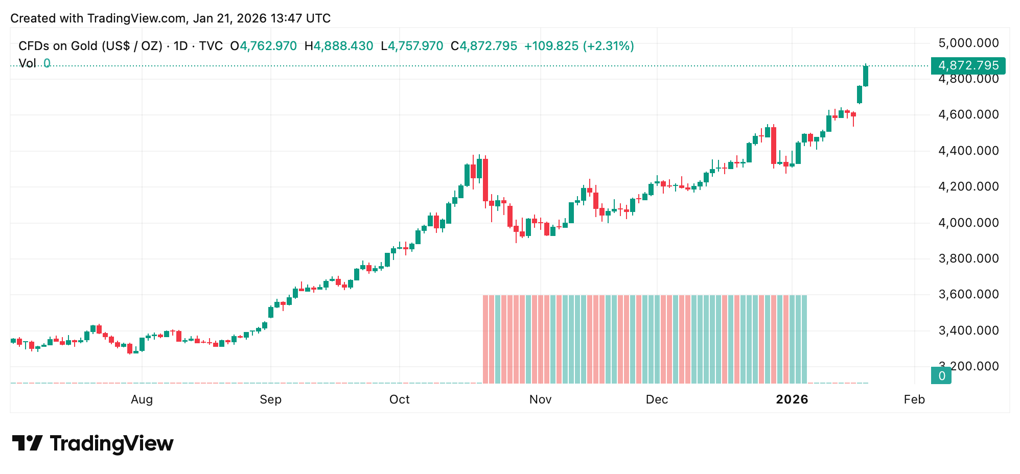 Alle 8:50 del mattino, ora orientale, l’oro viene scambiato a $4.872, mentre l’argento flirta con le tre cifre a $94,91. Il movimento è stato alimentato da turbolenze geopolitiche, timori di guerra commerciale e crescenti chiacchiere sul fatto che il regime monetario fiat possa essere vicino a incrinarsi.
