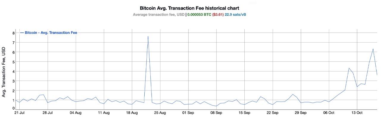L’ultimo aumento delle commissioni onchain è correlato con l’ascesa di bitcoin oltre i 68K dollari. Ad esempio, il 6 ottobre, la commissione media di trasferimento, secondo i dati di bitinfocharts.com, era di soli 0,81 dollari. Ora, quella commissione è aumentata di oltre il 354%, arrivando a 3,61 dollari. Il 17 ottobre, è aumentata ancora più drammaticamente, raggiungendo il 680% in più rispetto al tasso del 6 ottobre.