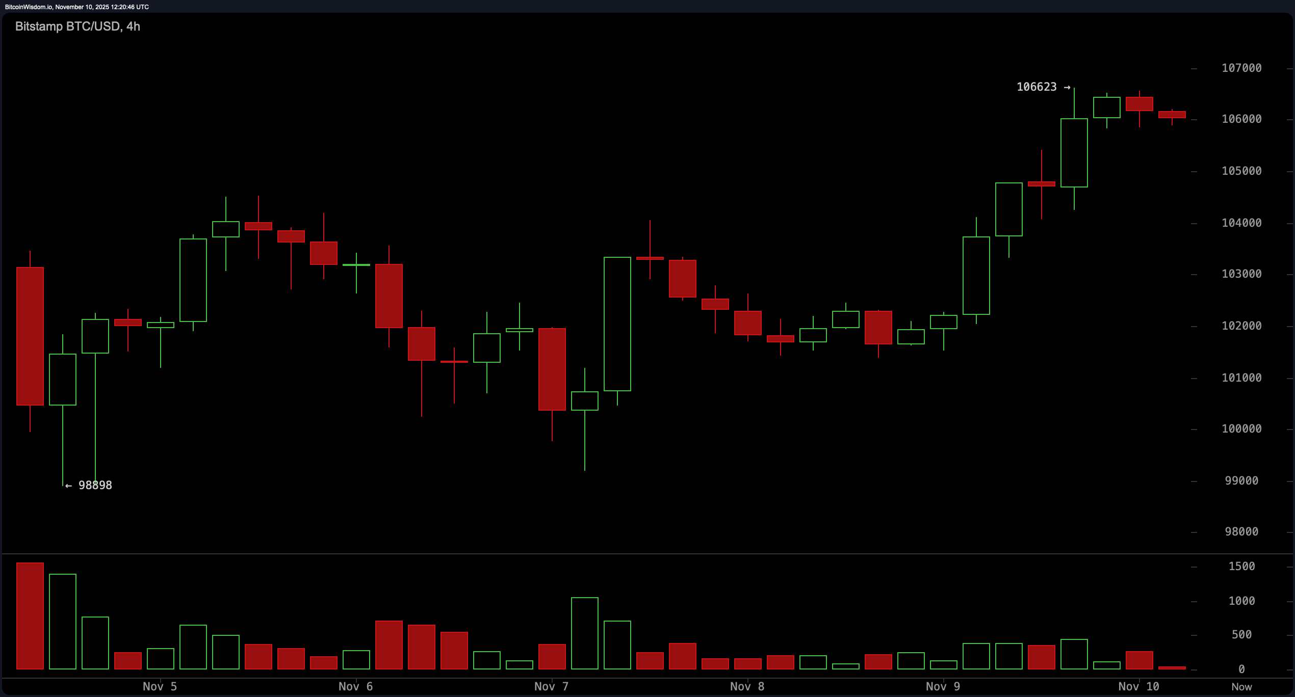 Ingrandendo sul grafico a 4 ore, il momentum sembra pronto per una partita di poker ad alto rischio. Una formazione a cuneo crescente si sta sviluppando, spesso un preludio a un ribasso, anche se nulla è certo nell’universo criptografico. Tuttavia, i minimi più alti cuciti insieme dal 7 novembre suggeriscono che un po’ di sicurezza rimane. Il volume sugli slanci al rialzo aggiunge un livello di intrigo, specialmente mentre il prezzo testa il soffitto della resistenza a $106,600 a $107,000. Se viene rotto con conferma di volume, bitcoin potrebbe saltare più in alto; ma una caduta sotto $102,000 potrebbe riportarlo alla zona psicologica di $100,000.