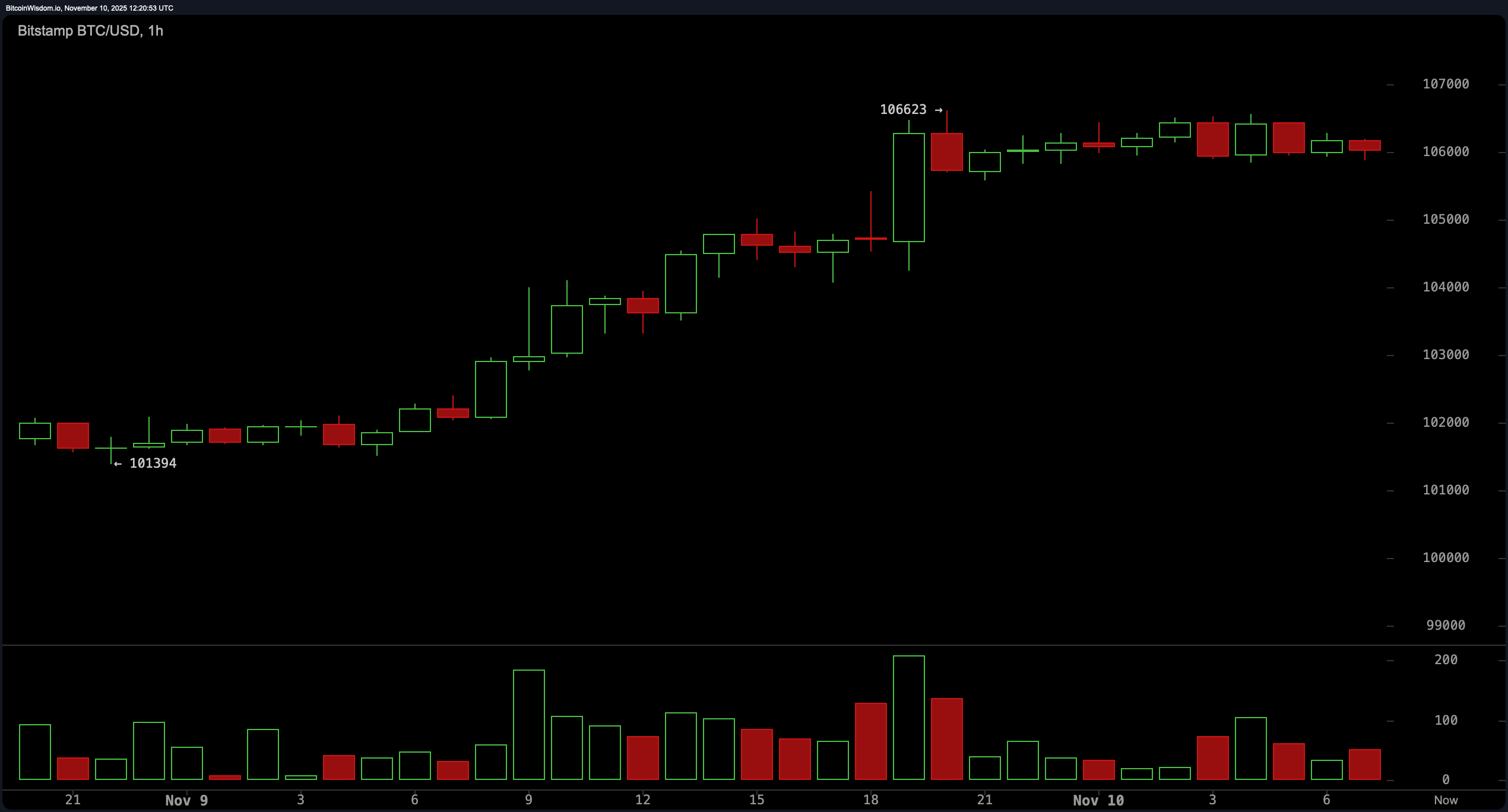 Ora, il grafico a 1 ora? È lì che l’ego a breve termine di bitcoin potrebbe essere al culmine. L’azione sui prezzi si è fermata vicino a $106,600, anticipando un breakout o un burnout. Con il volume in calo e una deriva laterale, potrebbe essere una classica bandiera rialzista—o un sussurro morbido prima di una correzione micro. Una rottura sopra $106,700 con volume rinvigorirebbe gli spiriti dei tori, ma una caduta sotto $105,800 potrebbe segnare l’inizio di un ritracciamento intraday.