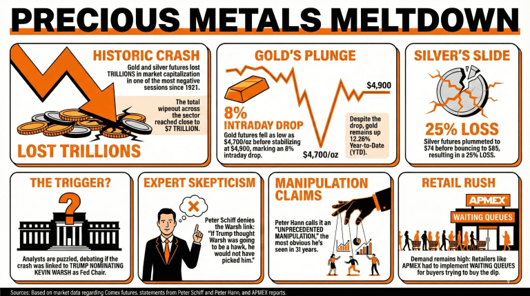 I prezzi di oro e argento sono crollati venerdì, segnando una delle peggiori sessioni di trading per il settore dal 1921, con trilioni persi in capitalizzazione di mercato. -