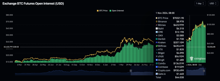- オプション市場の拡大: 2024年11月中旬までに、ビットコインオープンインタレストが40億ドルを超え、ビットコインの価格が70千ドルを超えると、急増しました。