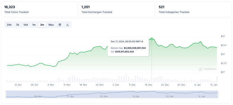 2024年末、暗号通貨市場には著しい変化が見られ、12月17日には総市場資本額が約3.908兆ドルに達しました。この増加は主に、ビットコインが初めて10万ドルを超えたことによって引き起こされ、アメリカでのスポットビットコインETFの承認がその背景にありました。これは長らく待たれていた規制の進展で、多大な機関投資を引き寄せ、市場の流動性を改善しました。また、イーサリアムやさまざまなアルトコインも、多くの機関の関心の高まりと金融界での受け入れの拡大から利益を得ました。