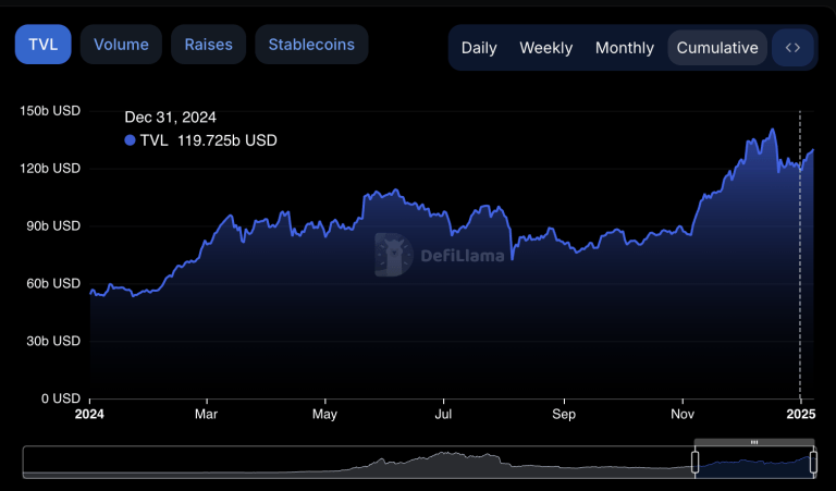 DeFiセクターは2024年に著しい成長を遂げ、総ロックバリュー (TVL)は2023年末の54.44億ドルから年末までに約119.72億ドルまで急増し、約120%増加しました。