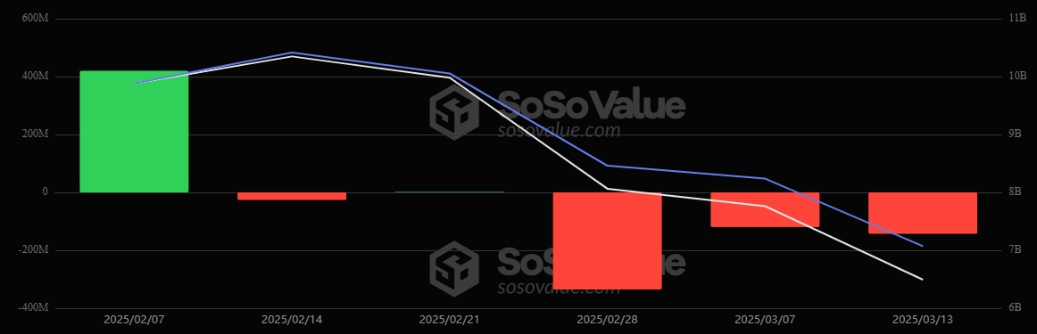 3月10日から3月14日の週に、ビットコインとイーサの上場投資信託(ETF)は引き続き顕著な純流出を記録し、投資家のセンチメントが非常にネガティブであることを示しています。