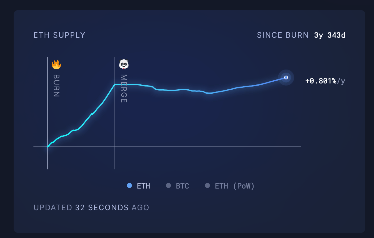 1,438日間で、イーサリアムネットワークは460万ETH以上を燃やし、デジタル資産で135.7億ドルの価値を失いました。しかし、それだけの暗号通貨が煙として消えた後でも、ETHの供給は増え続けており、現在の年間インフレ率は0.801%です。