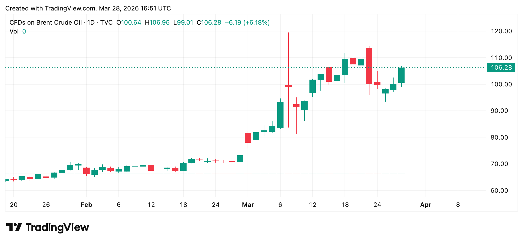 WTI原油は3月27日(金)に1バレルあたり99.64ドルから101.18ドルで取引を終え、前日から5%超、過去1か月で約40%上昇しました。ブレント原油は1バレルあたり105.32ドルから112.57ドルで取引を終え、アジアの買い手に実際の引渡条件を反映するドバイ原油現物価格は1バレルあたり約126ドルで取引されました。
