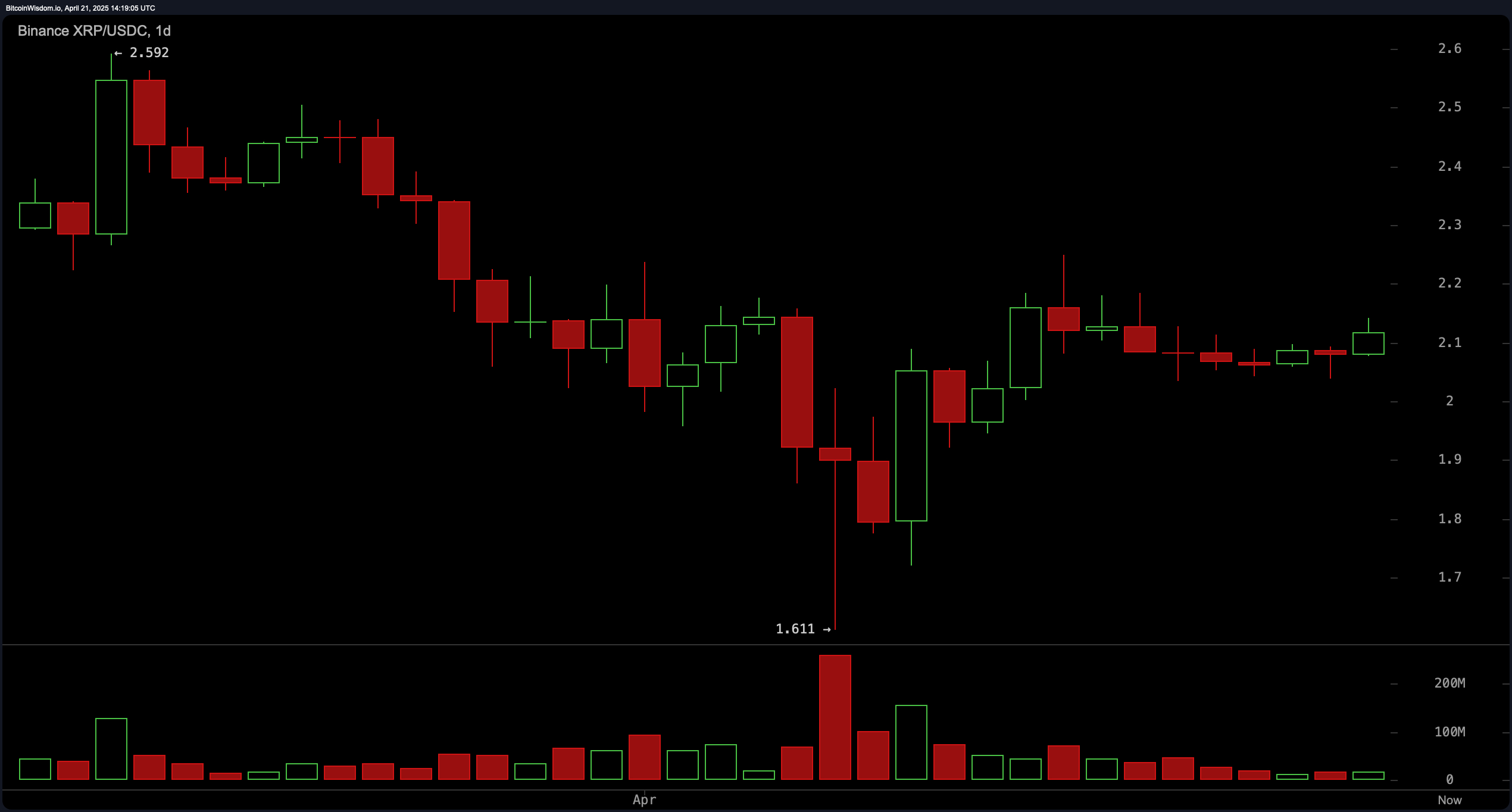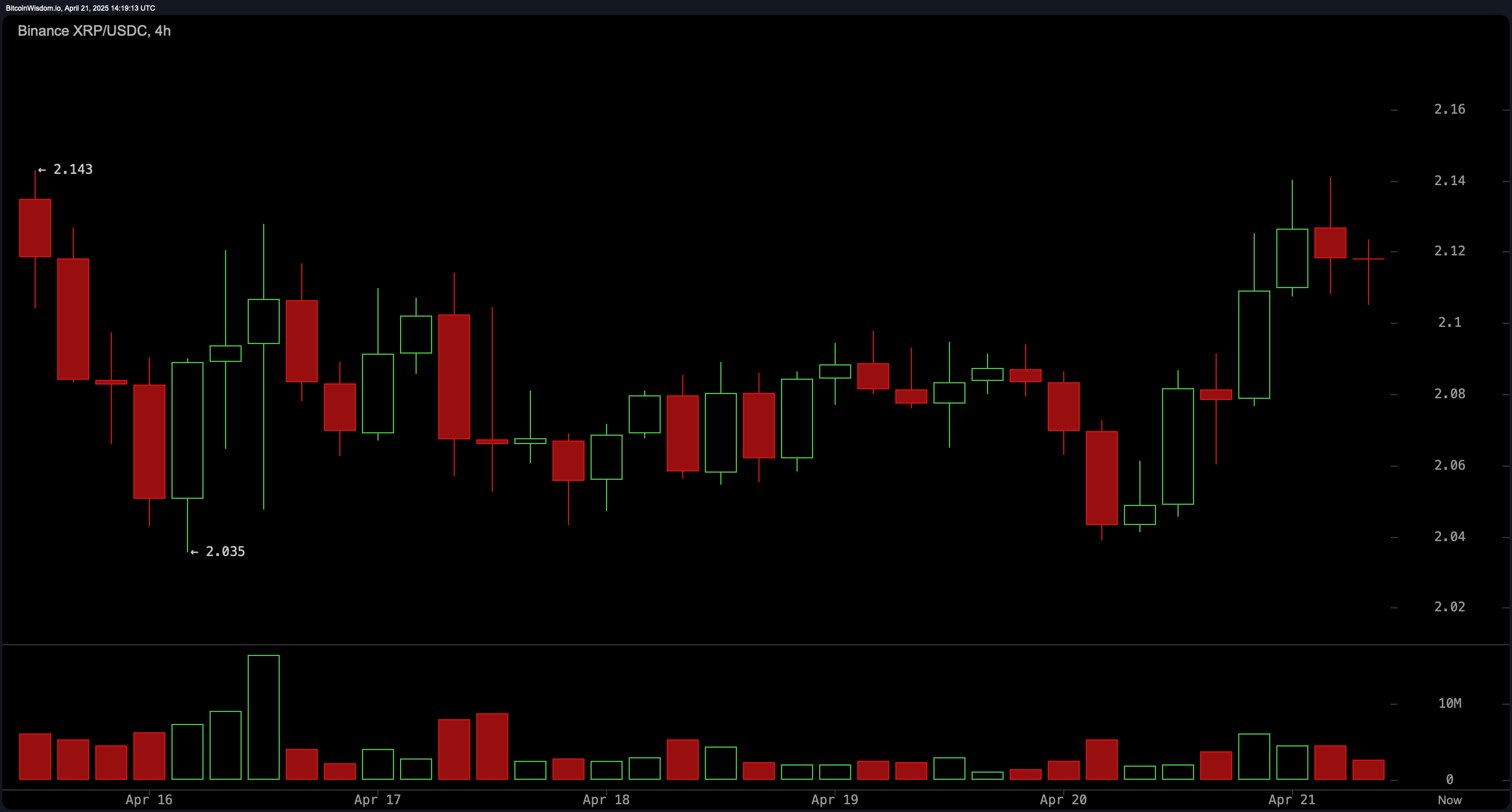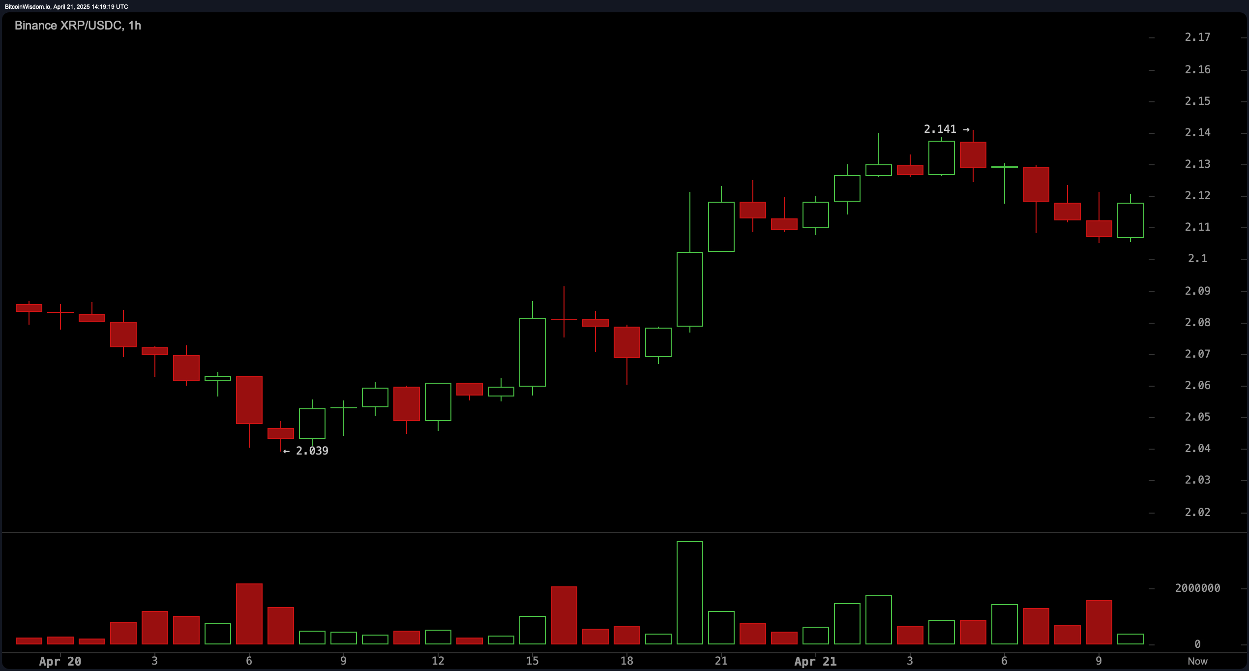 XRPの短期的なテクニカルセットアップは1時間チャートで強気のトレンドを示しており、4月20日以来2.03ドルから2.14ドルまで着実に上昇しました。現在形成されているパターンは強気の旗を示唆しており、通常はボリュームがトレンドと一致すると仮定すると、価格が継続する可能性を示しています。価格動向は2.11ドルをわずかに上回って統合しており、軽微な反発の中で回復力を示しています。2.10ドルのサポートが確認されるか、2.14ドルをすっきり抜けると、強気の見解を強化します。リスクを管理するトレーダーにとっては、2.08ドル未満でストップを設定しつつ、2.20ドルから2.25ドルの範囲で目標を設定することが賢明です。