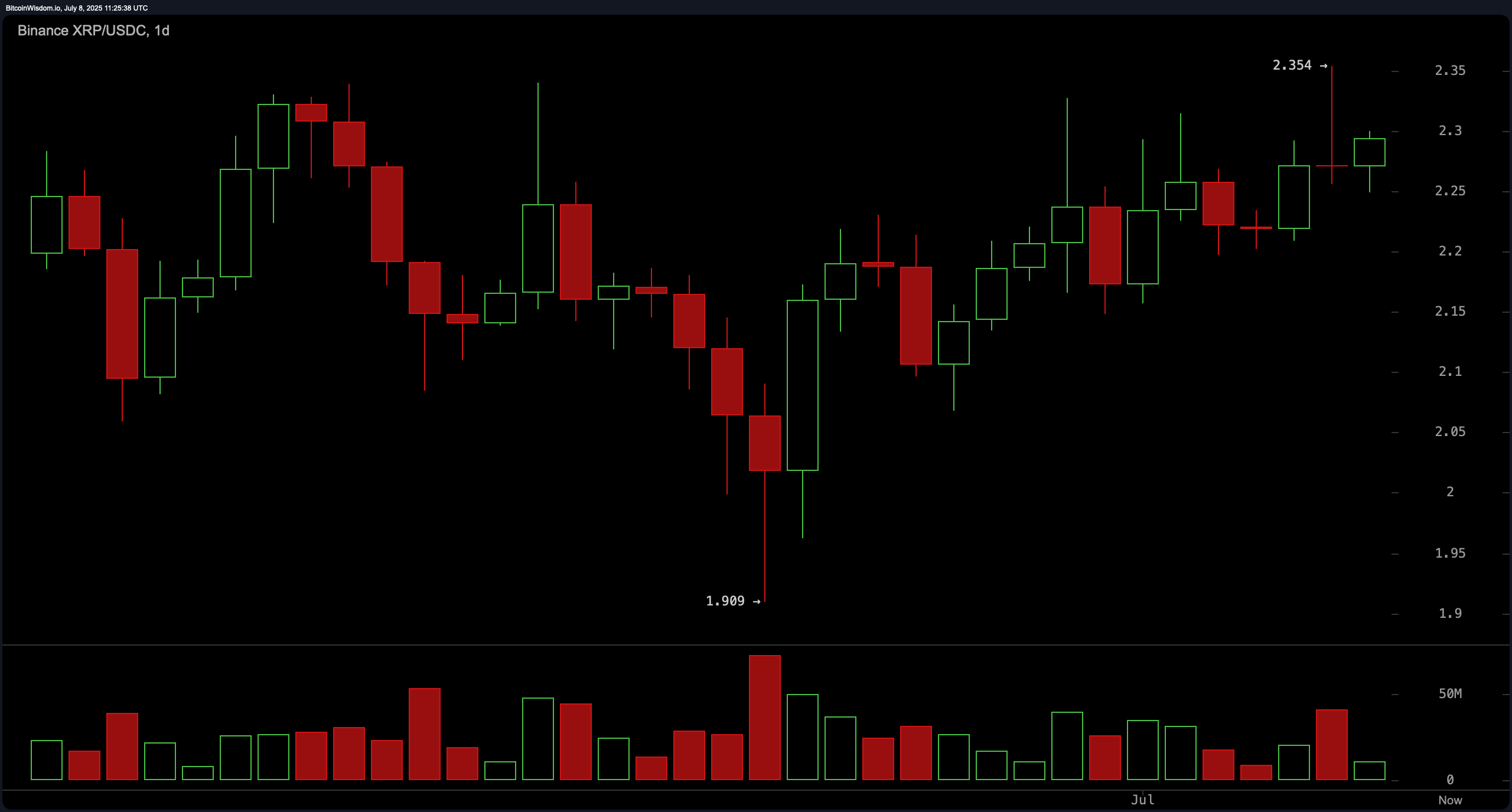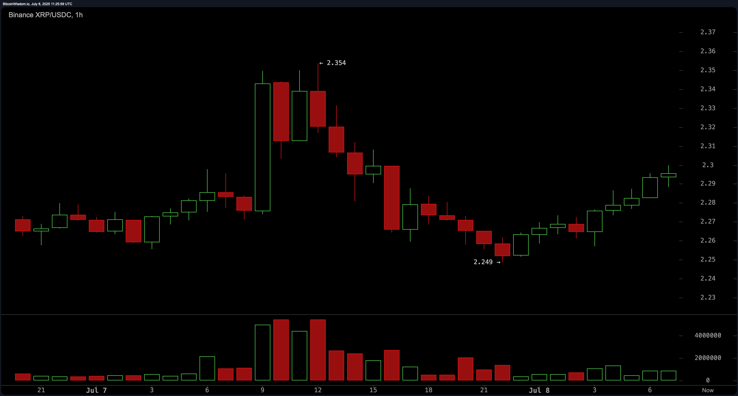 XRPは、2025年7月8日に$2.29で取引され、総時価総額は1,352.4億ドルでした。過去24時間の取引量は46.13億ドルに達し、価格は$2.25から$2.35の間で推移しました。