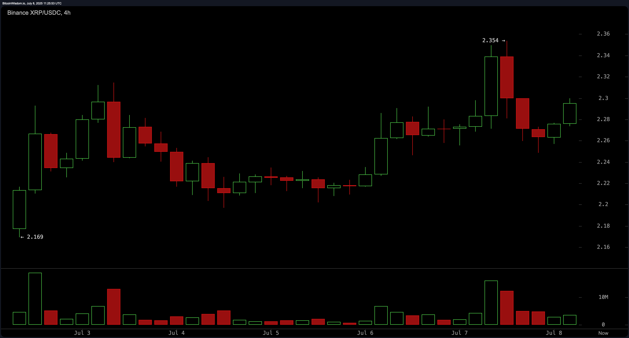 4時間チャートはクラシックなカップ・アンド・ハンドルフォーメーションを示し、上昇モメンタムの継続を示唆しています。XRPは$2.25から$2.27のゾーンで確かなサポートを見つけ、$2.35のレジスタンスを2回拒否しましたが、このレベルを突破しようとする新たな試みを見せています。7月7日の$2.30以上のラリー中に顕著なボリュームスパイクが発生し、機関投資家の関心を示唆しています。ハンドルが確認されれば$2.27から$2.29あたりで再エントリーを検討するか、$2.354以上のボリュームを伴ったブレイクアウトでエントリーします。利益確定目標は$2.42から$2.45で、保護的なストップを$2.25以下に設定します。