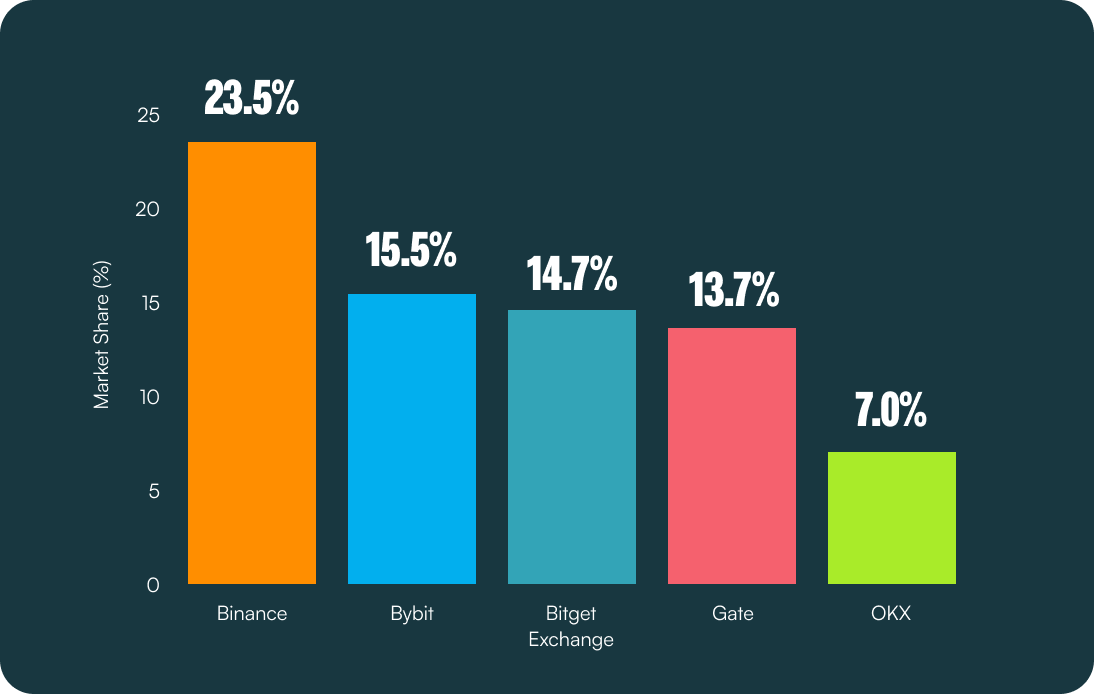 플랫폼 지배력: 바이낸스가 38% 시장 점유율로 선두. Bitget은 2025년 3위로 상승, 4월에는 920억 달러에 달하는 거래량을 기록하며 연초 4.6%에서 7.2%로 시장 점유율 상승.